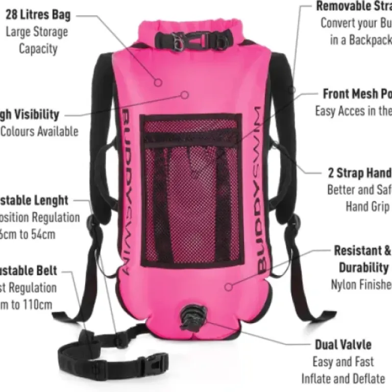 Concrètement, ce Buddyswim c’est une bouée de natation en eau libre qui fait aussi sac à dos. Capacité annoncée : 28 litres, taille d’environ 52 x 25 cm une fois gonflée. En gros, c’est assez gros pour mettre une petite serviette, un short, un t-shirt, des tongs et tes affaires de valeur. On est sur un matériau type PVC avec revêtement nylon, donc un truc plastifié assez classique pour les bouées de nage. La couleur rose est vraiment bien flashy, on te voit de loin, ce qui est le but.